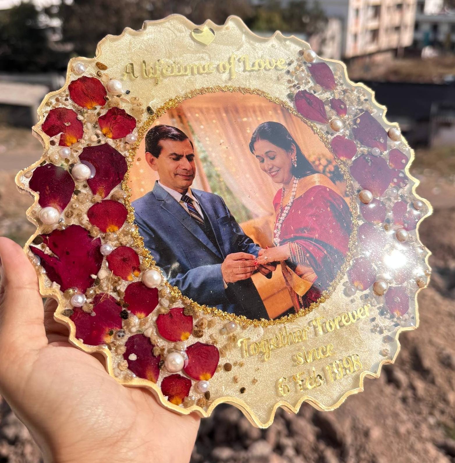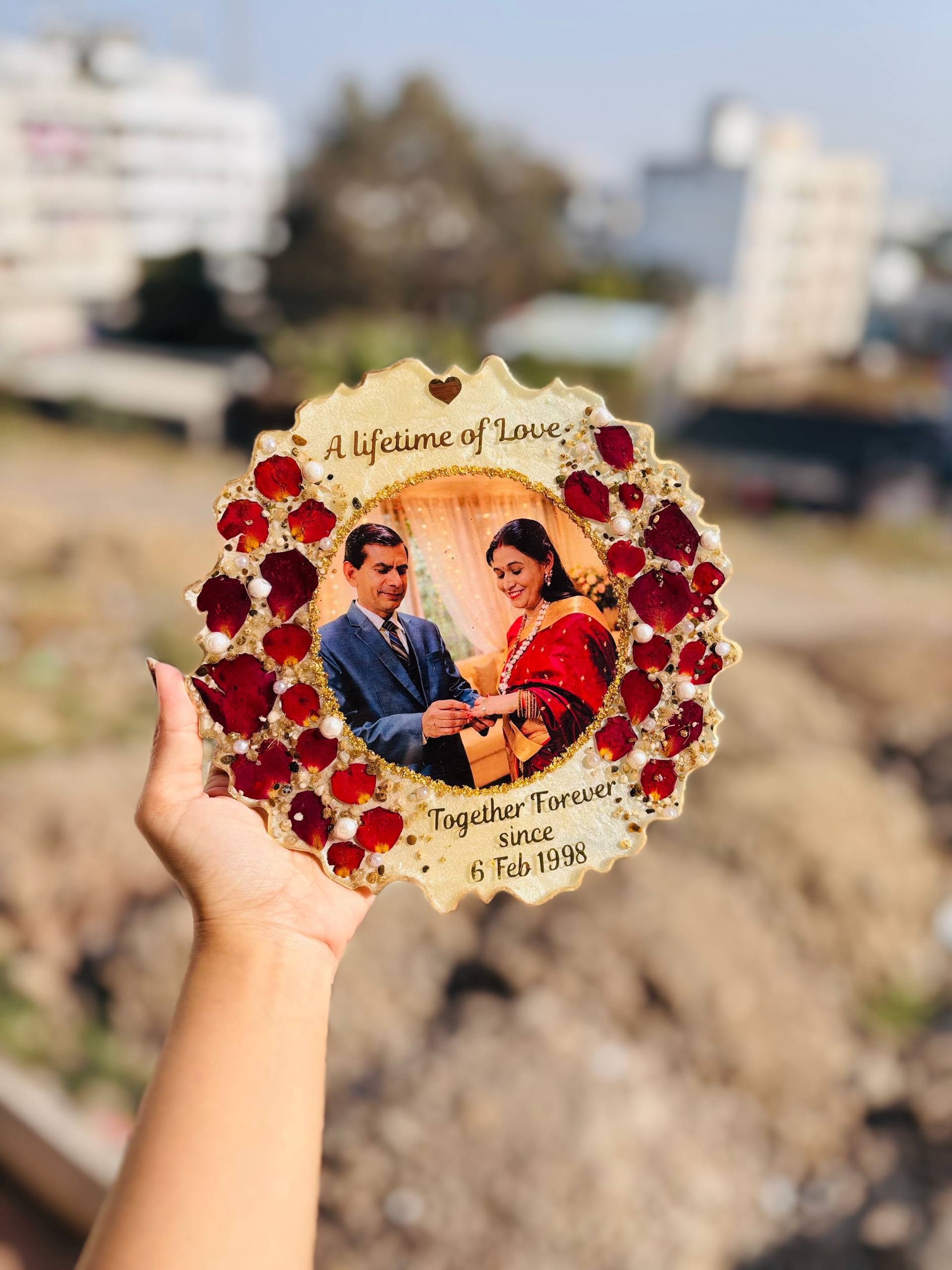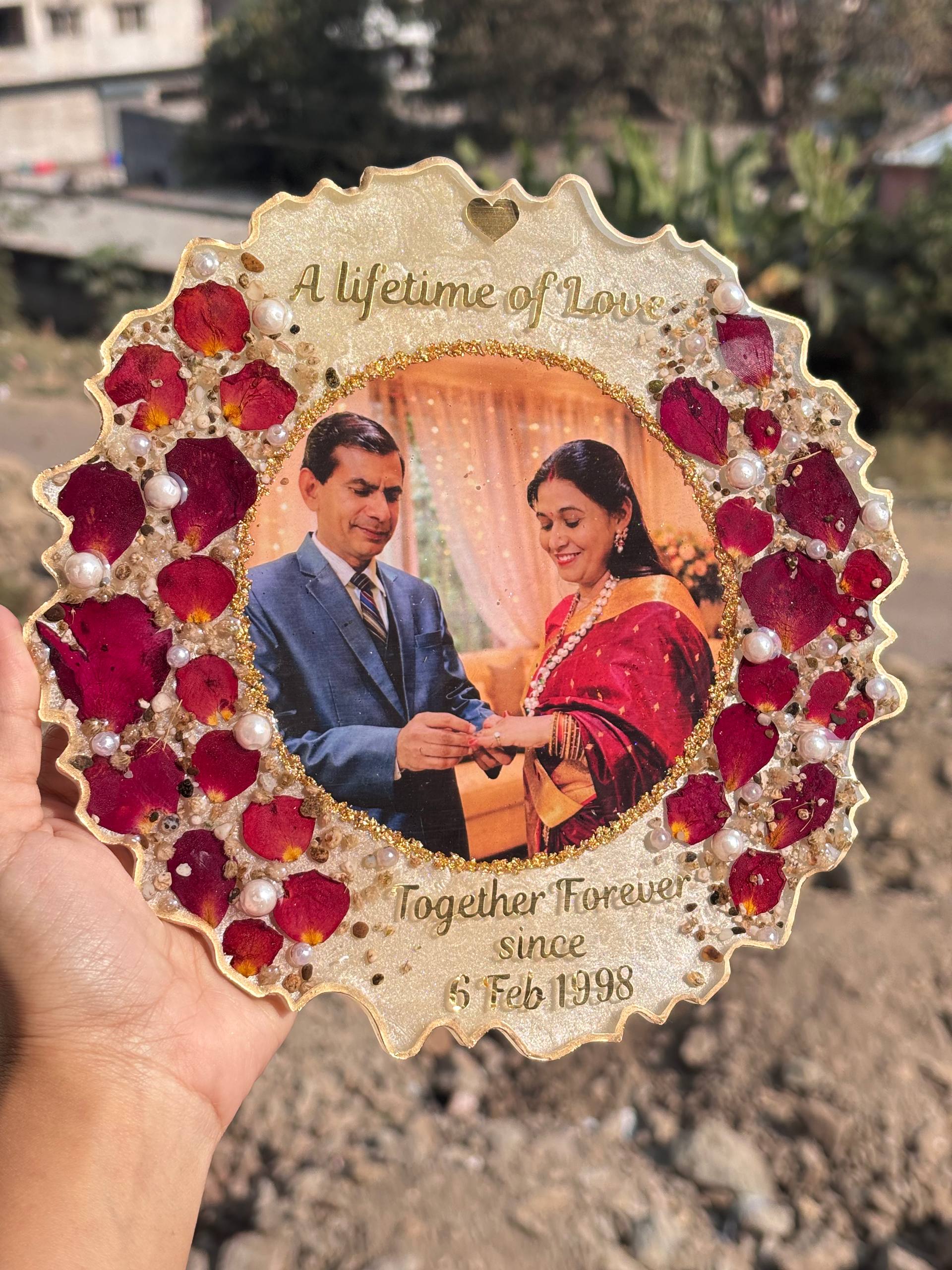 Celebrate a lifetime of love with our 8-inch Varmala Preservation Resin Frame, thoughtfully handcrafted to preserve the beauty and emotions of your wedding day. This elegant circular frame is made using real preserved varmala rose petals, delicate pearls, gold accents, and a cherished couple photograph sealed in high-quality crystal-clear resin.